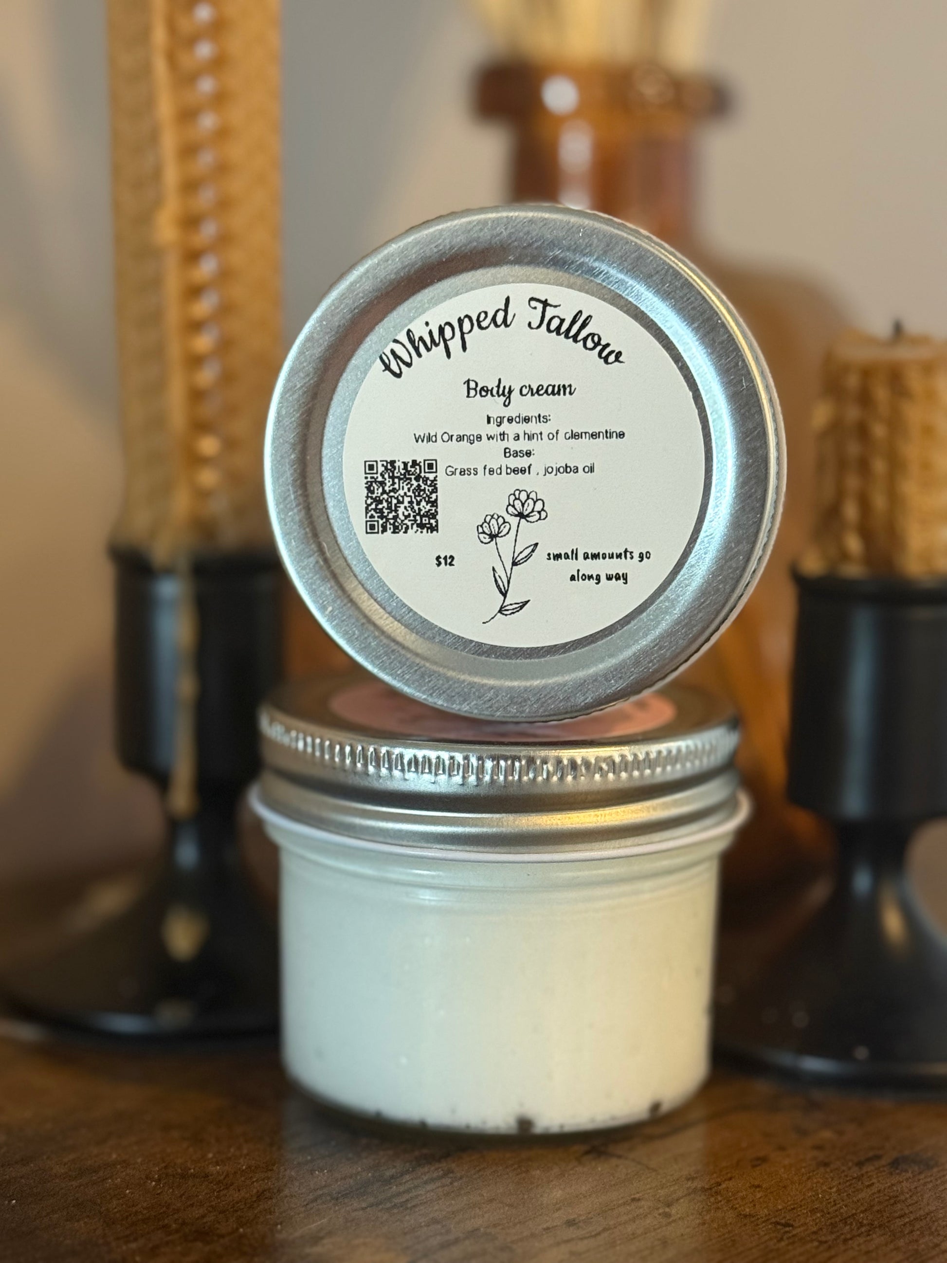 A silky blend of grass-fed tallow and jojoba oil, lightly scented with wild orange and a hint of sweet clementines. Deeply nourishing, with a soft citrusy glow.